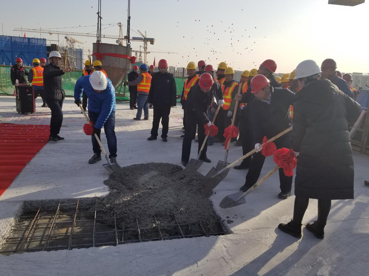 封顶仪式在项目经理张铁强主持下开始。在喜庆热烈的气氛中,项目建设、设计、监理、施工方的领导分别发表了热情洋溢的致辞。伴随礼炮声声和彩带飞舞,领导和嘉宾一起挥锹浇筑混凝土完成了封顶合龙。至此,大兴区庞各庄2号地棚户区改造安置房项目成为6个安置房标段中第一个完成封顶的项目。